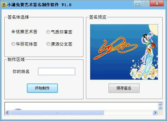 小湖免费艺术签名制作是一款在线免费艺术签名设计软件,不但可以设计出好看、个性的签名,重要的是,你可以对照练习,最终能够一笔神来,这才是本软件的目的所在!本软件操作简便,只需两部就可以制作出属于自己的艺术签名。目前提供了:优雅艺术签,华丽花体签,潇洒公文签和气质印章签 四种签名体随意挑选。是一款值得收藏的免费签名设计软件。