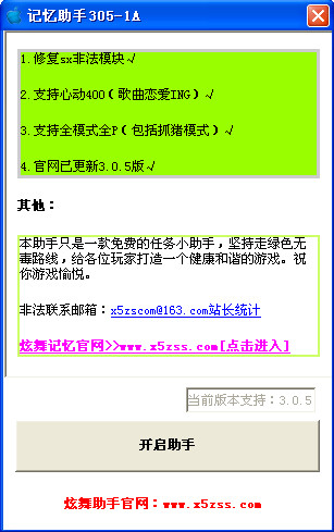 QQ炫舞记忆助手随版本更新,是一款功能强大的QQ炫舞多功能辅助工具。不过软件打开和关闭时均会有弹出窗口,请玩家使用时注意关闭。qq炫舞记忆助手免费高分工具功能简单实用,不破坏游戏平衡。无广告,无利润,不做任何商业用途!已经加入TGA检测。可以完美连续perfect great good god。 qq炫舞记忆助手免费高分最新版,更新频率非常地快,3.2.2心动版是最新的一个版本,如果你运行这款qq炫舞记忆助手时有版本更新提示,那么就升级吧!免费高分!炫舞记忆助手最新版支持炫舞全模式全p、长期挂机刷转转乐。过日常任务,心动400,黑屏,自动开始,快速返回等等。