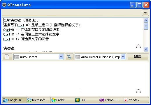 QTranslate 帮助你更好地利用在线翻译工具,目前支持 Google 翻译、Microsoft Translator、Promt、SDL Free Translation、雅虎翻译、Yandex、Babylon、Google Search、ImTranslator、Multitran、Wikipedia、WordReference 等翻译引擎或信息服务。