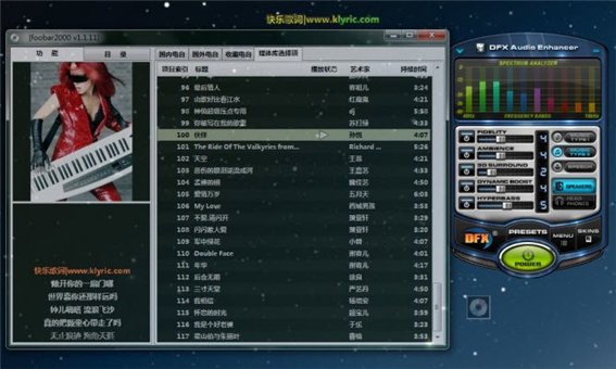 DFX 是一个媒体播放器专用的音效 Plug-In 外挂软件。DFX 有对 MP3 声音文件纠错、和声复原,立体声增强,3D 环绕,重低音增强等功效。安装它之后便可具有 3D 环绕音场效果。安装之后只要设定好便可让播放器播放的 MP3 或 WMA 时的声音具有 3D 环绕音场效果。