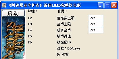 阿达尼亚守护者修改器中文版作弊 功能: F2 建塔数上限修改 F3 金币上限修改 F4 现有金币修改 F5 钱币满值 F6 锁定城堡HP