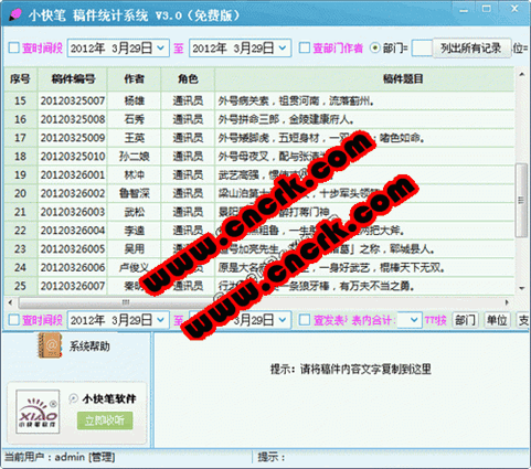 小快笔稿件统计系统即是为此研发的一款贴合工作实际需求的稿件统计系统。在您工作的时候只要随时记录,它将会让您的稿件统计与稿费发放工作从此变得轻松!