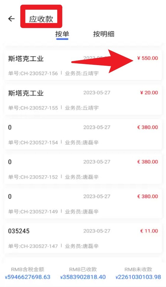 5. 在“应收款”模块中,您可以查看所有已发货但还未收到款项的订单记录,并且支持快速查询付款状态和金额。