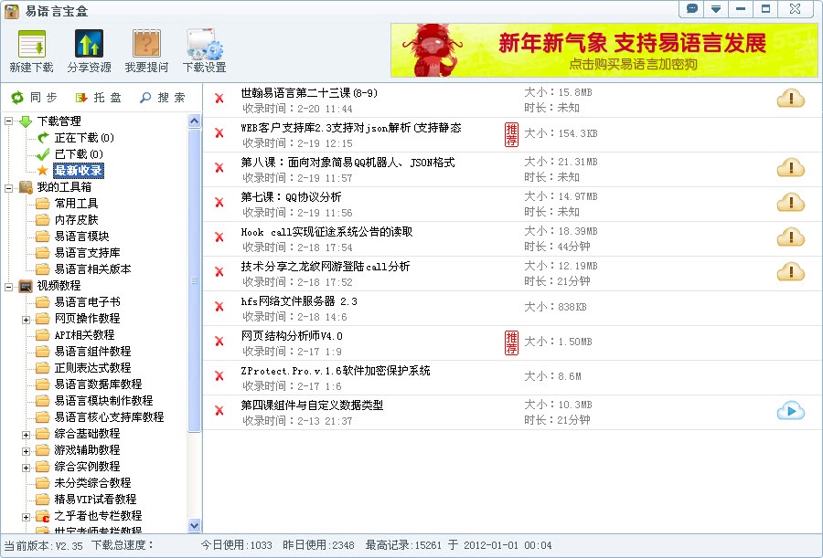 1、收集海量网上流行经典的易语言语音教程,和一些常用的工具,易语言模块,易语言支持库,方便大家学习需要时下载。2、能一键下载宝盒上已收集的的所有语音视频教程和工具,模块,支持库等等。