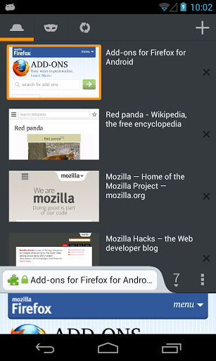 1、充分利用了Android多屏幕特性,创新的将多标签窗口设计在主屏幕的左侧,将其他功能和扩展项设计在屏幕的右侧,从而让 Firefox Mobile 成为了一款真正实用方便的多标签移动浏览器;