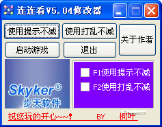 连连看5.04修改器 修改连连看5.04游戏的工具 非数值修改器 功能一叫做自身匹配,就是点一个方块两次就能消掉它,相当于自己和自己匹配 功能二叫做无视路径,就是只要两个方块相同,不管他们之间有没有路,都可以消掉