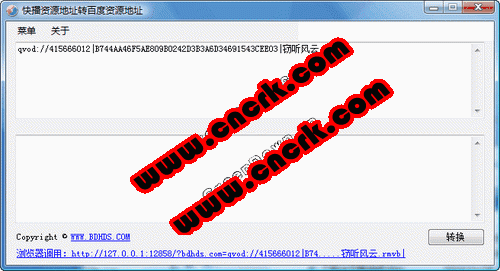 本程序特色是:采用浏览器协议,直接在浏览器输入:http://127.0.0.1:13858/?bdhds.com=qvod://.....|参数为快播地址就能直接输出百度资源地址了。每次只能单个转换。你可以用该功能用js ajax制作自己的转换插件。
