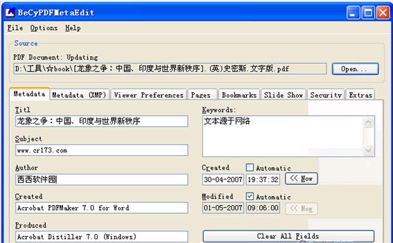 PDF信息修改(BeCyPDFMetaEdit) 编辑PDF的meta信息,meta也就是PDF的文件概述和摘要 还可以为PDF文件打水印,编辑页面目录等
