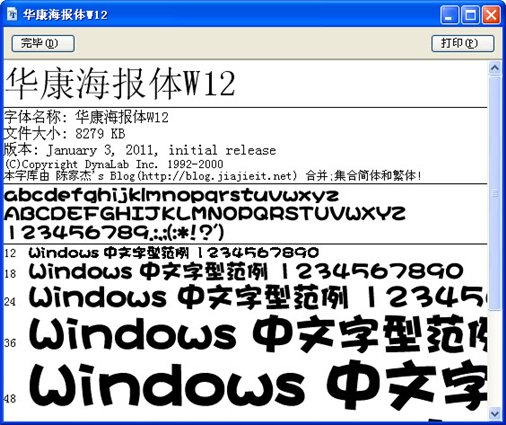 华康海报体,发现这个字体是分简体版和繁体版的,其实新型的个性字体都是这样的,使得使用简体的时候不能显示繁体,使用繁体的时候不能显示简体.真不明白现在的字体开放人员为什么不在发布的时候把它合在一起,使它像经典的字体宋体一样输入简体就显示简体,反之一样。此字库是简体字库(GB2312)和繁体字库(BIG5)合并而来的,可以在简体系统及繁体系统中直接使用。