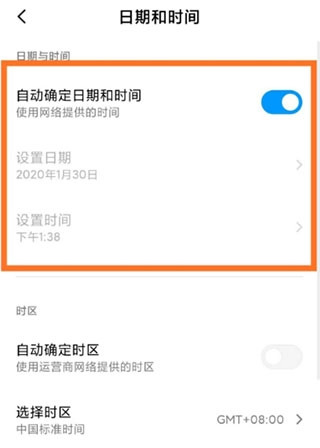3、进入时间和日期设置界面后,将自动确定日期和时间的功能关闭。