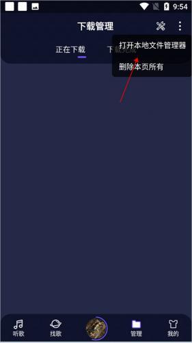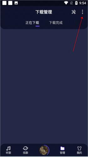 1. 在Fly音乐的【管理】页面,点击右上角的扩展菜单图标(如下面红色箭头所指)