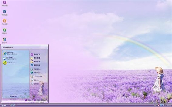 这款电脑主题十分温馨,主题的背景是暖暖的粉紫色,一个可爱的娃娃站在一望无垠的薰衣草花丛中看着天际的那道七彩彩虹,看到也会觉得开心吧,希望这款粉紫色的薰衣草xp主题能够给大家带来好运哦!