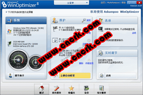 Ashampoo WinOptimizer 10具备一系列的系统维护工具:一键修复、磁盘清理、注册表优化、浏览器清理、磁盘碎片整理、注册表碎片整理等工具。通过这些工具你可以快速对系统进行全面清洁整理。