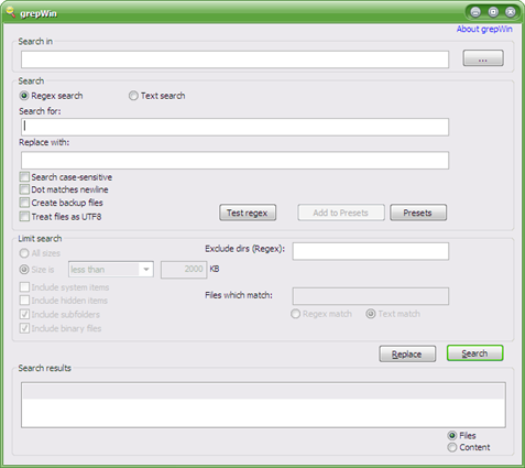grepWin 是一个 Windows 下的支持正则表达式的文件搜索工具