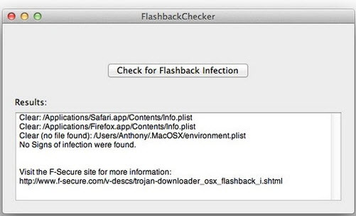 用户只需打开软件,点击一个按键就开始扫描系统是否感染了FlashBack木马。如果它显示 “No Signs of infection were found.(如图)”,恭喜你,你的Mac没有感染Flashback木马。即便如此,我们也不能掉以轻心。苹果已经发布了针对这一木马的Java补丁,建议Mac用户安装该补丁。