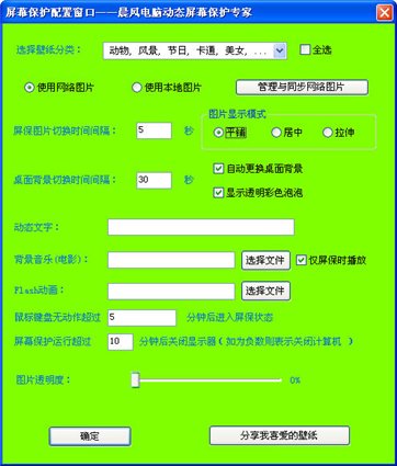 晨风电脑动态屏保软件是一款电脑动态屏保下载软件,该软件支持设置密码保护、显示时钟、自动切换一键进入屏保、自动下载网络上的精美图片、隐藏、锁定文件夹、定时关机、定时执行等各种操作任务。