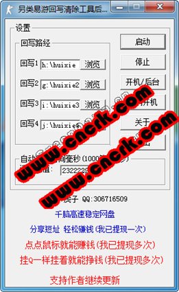 自从另类易游回写清空工具出世以来,已经更新了四次差不多了,从最初的只有一个回写,到支持多回写,在到上支持开机后台,更新浏览路经等等吧,谢谢各位网吧老板和技术员的支持了。多谢各位提的宝贵建议,让偶一次一次的修正了软件的缺陷。欢迎支持作者当然也没有一定要您必须得捐助才能使用此软件,您还是可以永久的免费使用的,支不支持看您的心情了。我也不会为了一块钱跟您急的呵呵。此次更新提供了后台服务界面显示和停止后台服务功能,去除了广告弹出。只以文字形式显示广告链接。