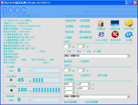 笔记本CPU温度检测工具 v2.17 绿色版 笔记本CPU温度监测工具BOCC是一款民间创意免费单文件监测工具.监测CPU温度.硬盘温度.CPU使用率.内存使用率.超过设定上限会报警提示!CPU温度.硬盘温度报警也可以自动关机!有定时关机.重启.待机.提醒功能.日程提醒功能!用户可以设置报警延时.自动关机延时!可以在任务栏显示监测内容!唯有不足的就是有些笔记本显示不出CPU 温度来!