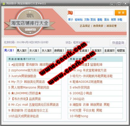 淘店助手 2.3 简体中文绿色免费版 淘店助手是淘宝旗下店铺的导购工具,收录了淘宝旗下的女装类、美妆类、鞋包类、减肥美体类、男装类,体育用品类、男用品类、手机类、相机类、电玩类、mp34类、居家类、饰品类、婚庆类、床品布艺类、内衣袜子类、母婴类、童装童鞋类等18类旗舰店和金冠店,并根据每个店铺的描述相符、服务态度、发货速度以及好评率等多项因素进行综合性评分,最终精心排列出每个大类中的前10名店铺,奉献给您,我们将定期安排动态更新,保障您通过使用这款软件,在淘宝每一次购物都能享受到最好最优最物超所值的服务。