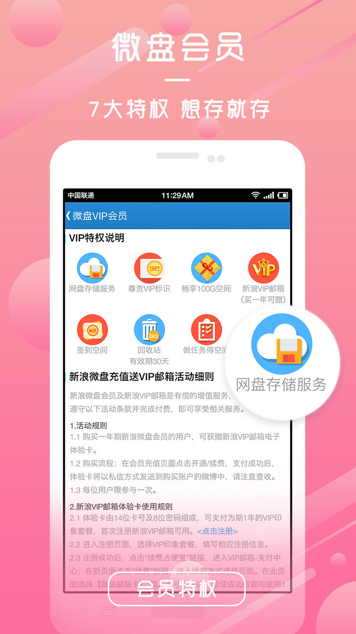 免费空间:默认2G,邀请好友最高可达10G。同步功能:只需将文件拖拽到'我的微盘'同步目录,即可上传并同步到任一终端。