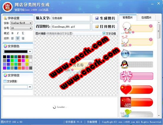 网店分类图片生成软件,可用来生成淘宝网、腾讯拍拍、百度有啊等网店左边商品分类图片,让你的网店瞬间变得更漂亮,吸引更多顾客上门,快速提升网店成交量. 本软件为绿色软件,不需要安装,解压缩之后即可直接使用.