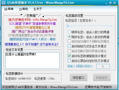 QTalk外宣助手一款用于QT语音全自动向他人发送私密消息的软件,可自动跳过管理马甲(红马、黄马、紫马)同时可配合QTalk外宣管理工具让各位OW随时查看外宣人员的工作情况,轻松实现外宣考勤。是每一位合格的外宣必备的神器!