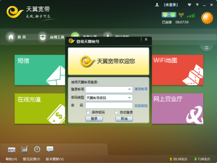 支持天翼宽带WiFi、3G、有线宽带(ADSL)和家庭无线高速接入互联网