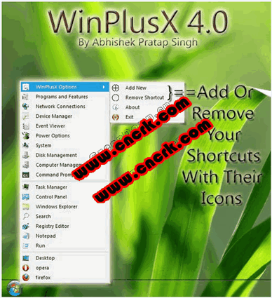 WinPlusX V4.0 英文绿色免费版 WinPlusX windows 8去除了开始菜单和开始按钮,但是新增了快速访问菜单,我们可以通过win+x来调用,快速菜单内置了最常见的任务选项,用起来非常方便。winplusx是一个辅助软件,它能够为xp、vista或windows 7系统带来win8中的这一功能,而且用户能够自行添加、删除其中的选项。