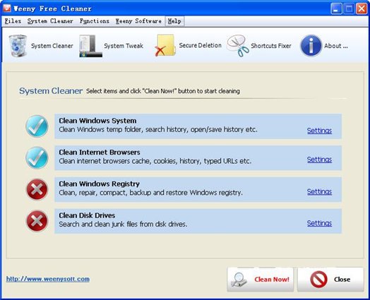 系统清理提速(Weeny Free System Cleaner)是一个免费的系统优化工具,可以一键清除windows中的所有系统垃圾,注册表中无用的键值,删除浏览器的缓存、历史记录、cookie。甚至点击按钮还能够把windows的设置恢复到默认状态。这样系统就可以健步如飞了。