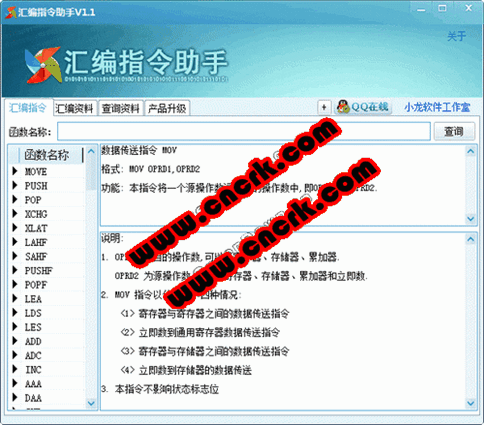 1、汇编指令查询功能,非常全面的汇编指令以及说明介绍。