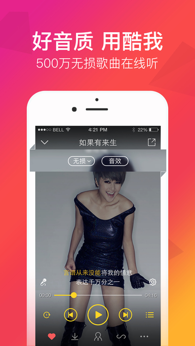 前的版本很好,特别是歌词和图片设计的不错,如果能下载手机铃声,就更完美了,我支持你们。界面精美,歌曲丰富,更新快速,分类多彩,音质优良,连接快速,希望酷我音乐越来越好!!!iPhone 版酷我音乐盒手机版是最受欢迎的 iPhone 在线听歌软件,同时完美兼容 iTouch 和 iPad。酷我听听提供百万高品质正版音乐,一键搜索海量曲库,精心打造权威榜单,并支持对本地iPod中音乐的播放。把百万歌曲装进口袋,随时随地想听就听。