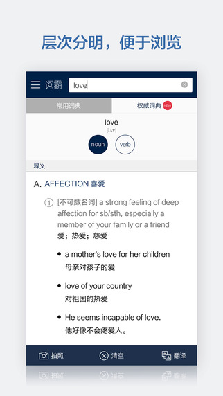 金山词霸iPhone版来自金山软件旗下的一款久经考验的、功能强大的、翻译精准的手机词典App,金山词霸iPhone版这么多年一直免费为中文用户们提供翻译支持,也是很多学习英语的童鞋们随身词典,是一款最便捷、最完整、时间最长的一个词典软件了。它在帮你翻译是有中英、解释,很容易明白并且记住,它用起来也很方便,中文翻译英文,同时可以英文翻译中文。它的词汇覆盖性很广阔,一词多意也把所有的意思讲全面了,金山词霸在各方面都很好用【软件特点】
