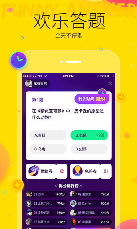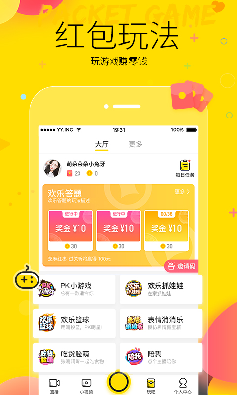 YY APP 全面升级为“YY陪我版”快乐大本营推荐游戏“隔空抓娃娃”、“欢乐吐篮球”等全球最新互动直播游戏玩法全面上线!上YY, 无聊全走开,陪你一起玩到嗨!超过10亿用户的忠实选择,7×24陪你乐翻天!