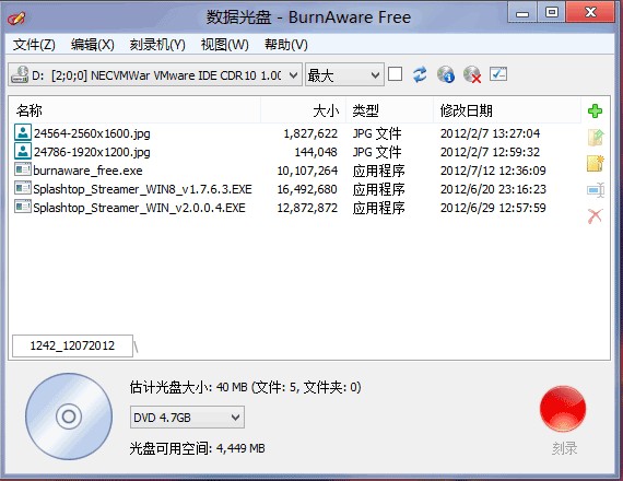 BurnAware是一款简单易用的光盘刻录工具,支持几乎所有的光存储媒体,具备良好广泛的硬件兼容性。该光盘刻录机能够刻录数据光盘、影音光盘、光盘镜像等,同时适用于高级用户和初级用户,而且终身免费。通过BurnAware你可以把网上的视频,自己拍摄的视频刻录成CD、DVD、HD-DVD、蓝光等,适用于永久保存。