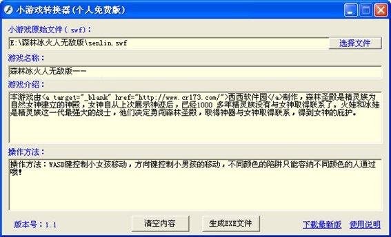 简单几步,就可以把SWF格式文件转换为exe可执行文件,看图就可知道怎么做了。 小游戏转换器个人免费版,不支持批量转换,可自定义游戏介绍,游戏操作说明等。