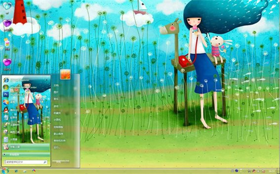 这款主题的桌面背景是一个女孩和兔子坐在一头木驴上,女孩幸福的吃着冰激凌,而兔子在旁边看着,她们是何等的快乐自在啊,还有她们身处在一片绿色之中,显得更加惬意!