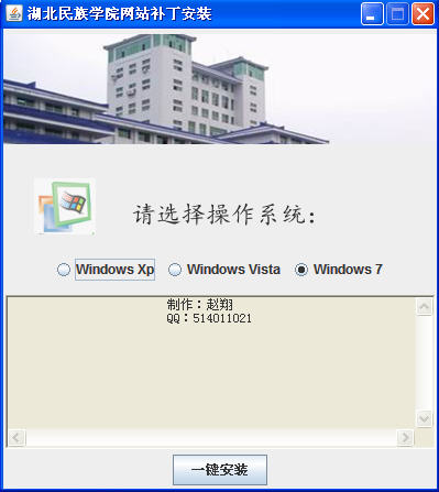 湖北民族学院补丁 一键安装 很好用的哦,简单,快捷,方便,实用!呵呵...部分win7 用户需解决权限问题,安装时需关闭杀毒软件!