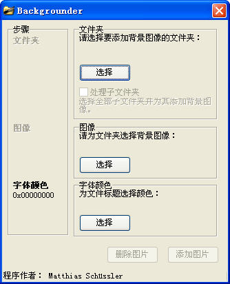 程序分为三步,选择文件夹,选择图片,为选择的文件夹添加图片,可以包括子文件夹。