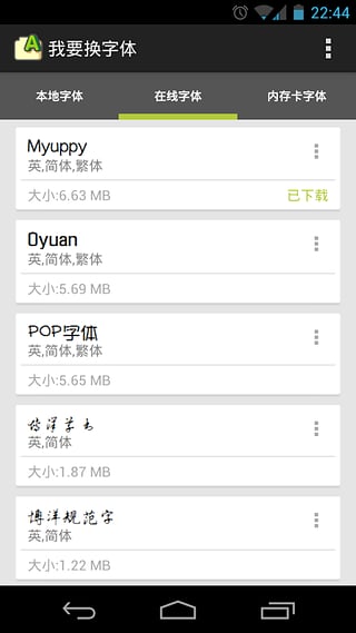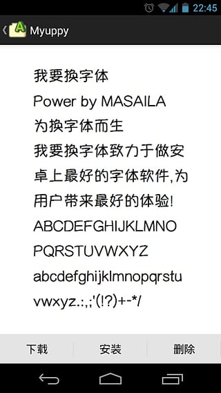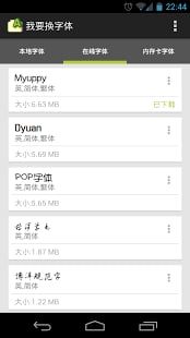 我要换字体是你更换系统字体的首选! 我要换字体是一个功能强大的免费的本地字体,在线字体和内存卡字体的字体查看器和安装器。 适合android2.1以上的用户使用。
