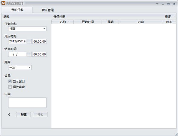 美明定时助手是一款功能全面、操作简便的定时工具。美明定时助手用于创建各种定时任务,如提醒、打开文档、运行程序、播放音乐、待机、关机等,支持一次、每天、每周、每月、每年以及自定义循环时间.美明定时助手具备有效时间检测机制,让您不再错过重要的工作和事情。