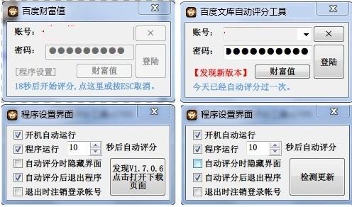 百度文库自动评分工具是一款增加百度文库财富值的辅助工具。经常要帮领导下载一些文件,主要是百度文库之类的。一开始苦于没有财富值,所以就自己写个自动工具,自动登录百度文库,随机找文章评分,以增加财富值,因为百度的限制,每天只有前5次评分才能获得财富值,5次文档评分,5次文辑评分,就是10个财富值了。。。