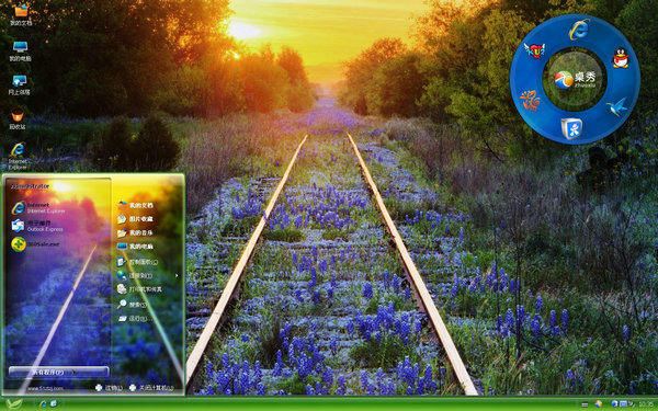 这款主题的桌面背景是一条废弃的铁轨上长满了蓝色樱花草,在夕阳的照耀下,它们是宁静优美的