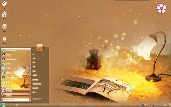 每个人都希望自己的人生中充满暖光,这样的人生才不会觉得冷漠吧,这款win7主题的电脑桌面上是一个花朵似的台灯散发出橘色的光芒,还有一本摊开的书和一副眼镜,应该是主人看书累了,暂时离开吧,这几款简单的东西构建了一个宁静的夜晚