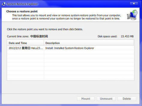 1.启动软件,System Restore Explorer 会自动显示你当前系统里的还原点有哪些,你可以选择将还原文件删除或是选择还原点后,点击 【Mount】查看更加具体的备份的内容:
