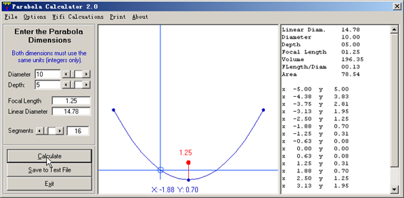 抛物线计算器是一个好用的应用程序,允许您使用的直径和深度作为输入参数的计算和画出一条抛物线。 输入的参数和坐标,让您可以查看相应的抛物线的形状和大小。