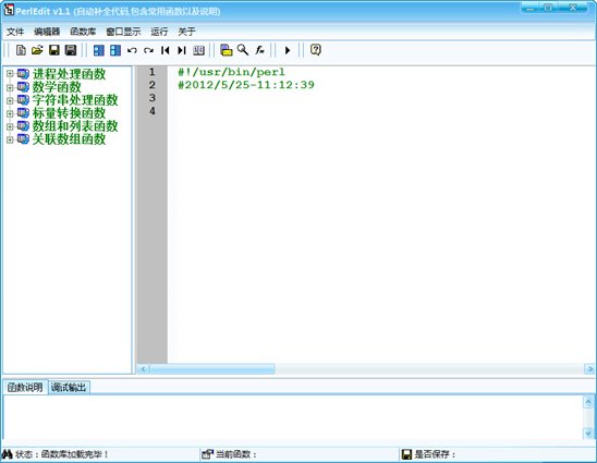 PerlEdit代码编辑器,代码提示,自动补全,代码高亮,自动缩进, 自动记忆声明的变量,下次使用时同样具备提示功能,可直接运行代码,并查看输出,输出编辑框, 窗口可调整,隐藏或显示"函数窗口"与“调试输出窗口”。