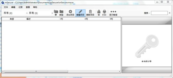 软件的主界面,上方是快捷工具栏,可以进行新添加密码、添加分组、编辑已存在的密码等操作。左侧是密码列表,可以点击快捷工具栏【所有】的下拉三角按不同分组查看。右侧是对应左侧选中密码条目的详细信息,点击后面记事本的图标可以将信息复制到剪切板。右上角搜索条目。