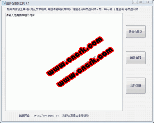 酷开伪原创工具 1.0 简体中文绿色免费版 酷开伪原创工具是一款免费的专业伪原创工具,专门针对谷歌、百度、雅虎、ask等大型搜索引擎收录设计,通过伪原创工具生成的文章,会更好的被搜索引擎收录和索引到.特别适合qq类型网站.如qq网名 qq签名. 主要功能为打乱文章排序,并自动复制在剪切板.