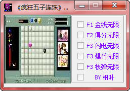疯狂五子连珠修改器 传统与现代结合的经典益智游戏 主要功能: F1 金钱无限 F2 得分无限 F3 闪电无限,爆竹无限,核弹无限 作弊器使用条件:进入游戏后才能修改哦!