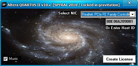 3.运行 licgen.exe,在 Select NIC中选择一个网卡,后点Create License,产生一个dat文件,将其放入\altera\10.0\quartus(若更改了默认安装目录,则在你选择的安装主目录下)